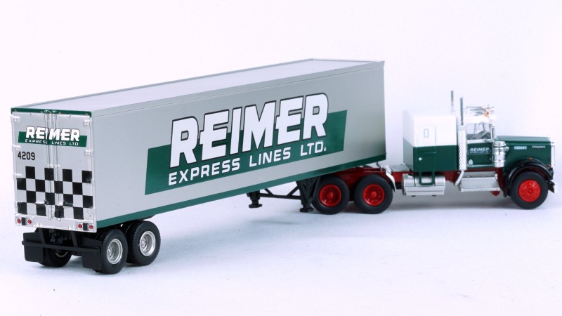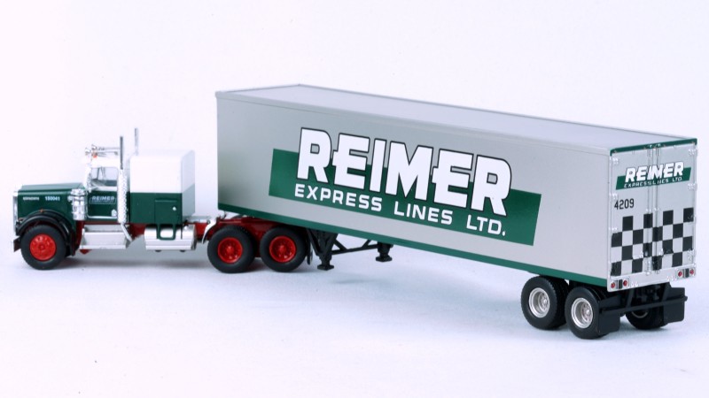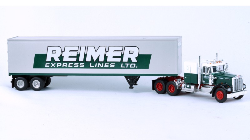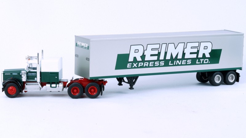 BRE86258 - HO Scale Brekina Kenworth W900 Tandem Axle Truck Tractor & 45' Trailer - Green/White "Reimer"