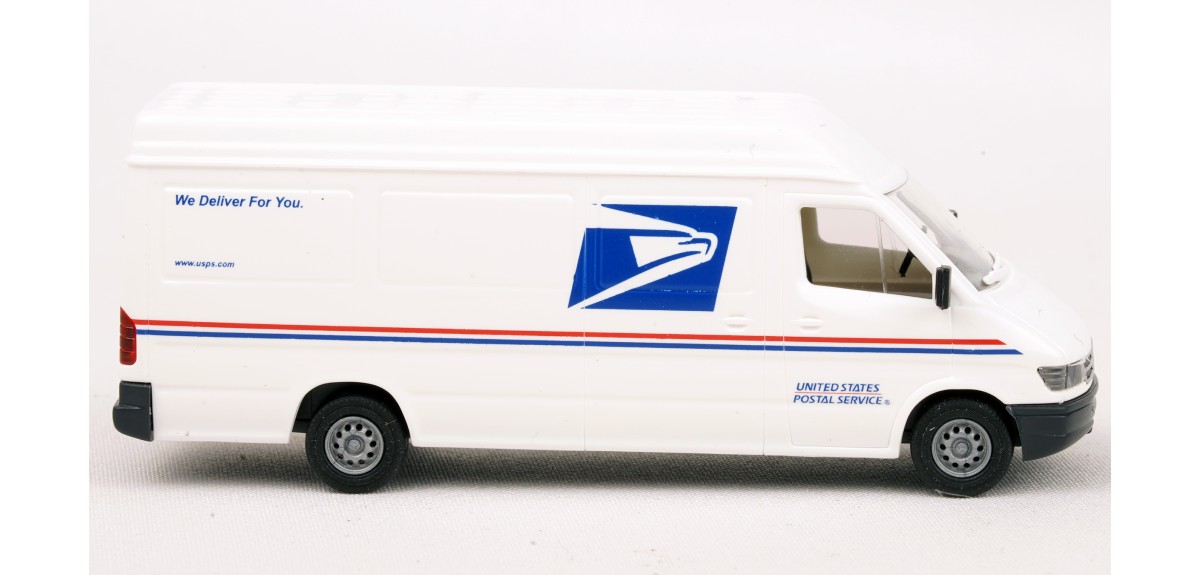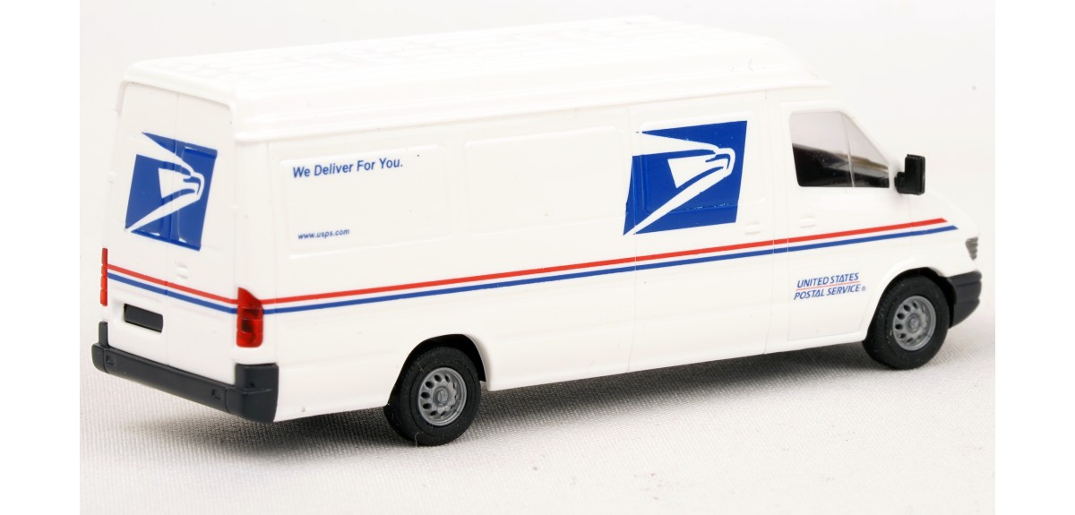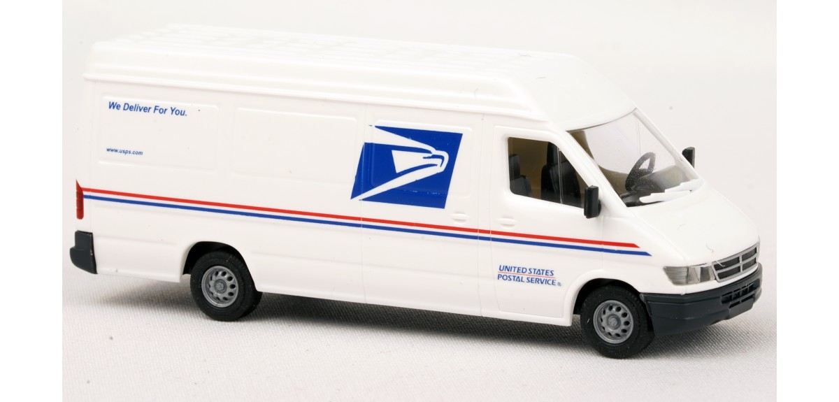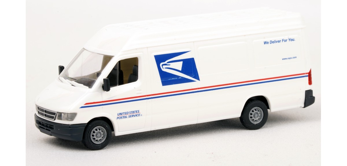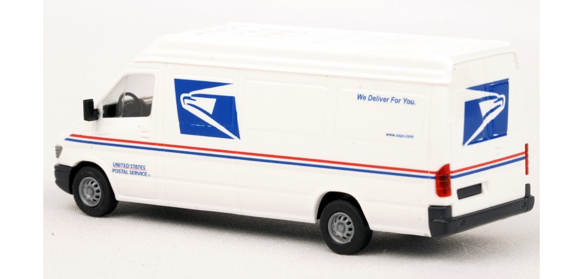 Assembled model (except for mirrors; user installed) with USPS (U.S. Postal Service) markings. Dodge Sprinter model is produced by Busch.