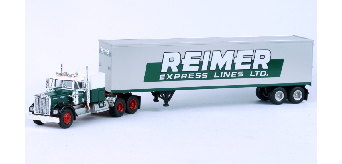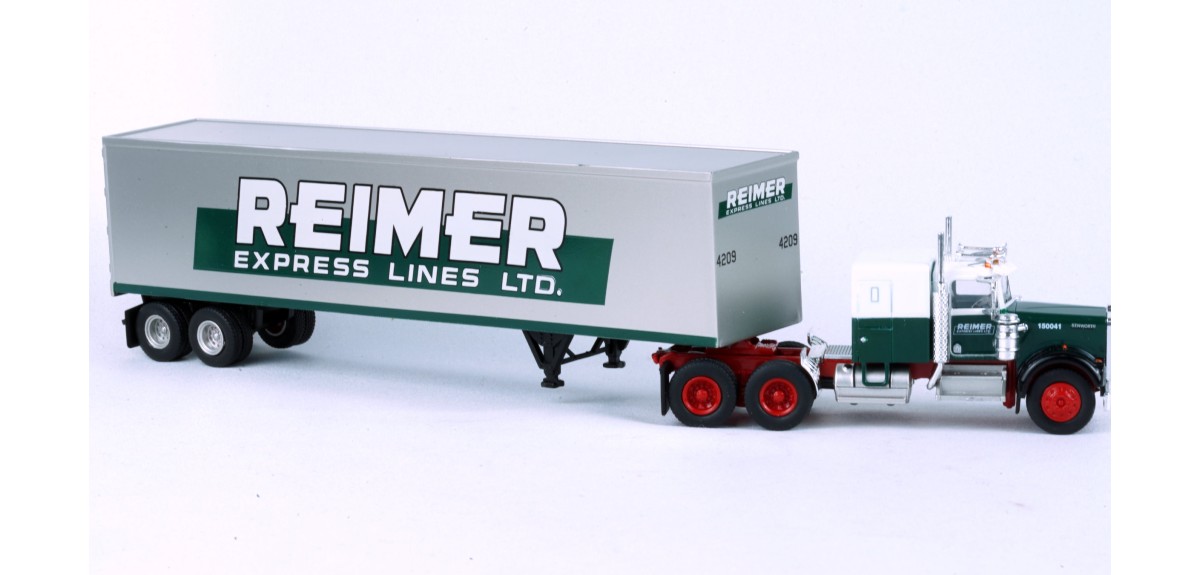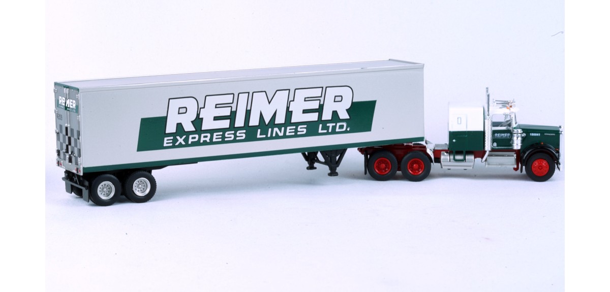BRE86258 - HO Scale Brekina Kenworth W900 Tandem Axle Truck Tractor & 45' Trailer - Green/White "Reimer"
