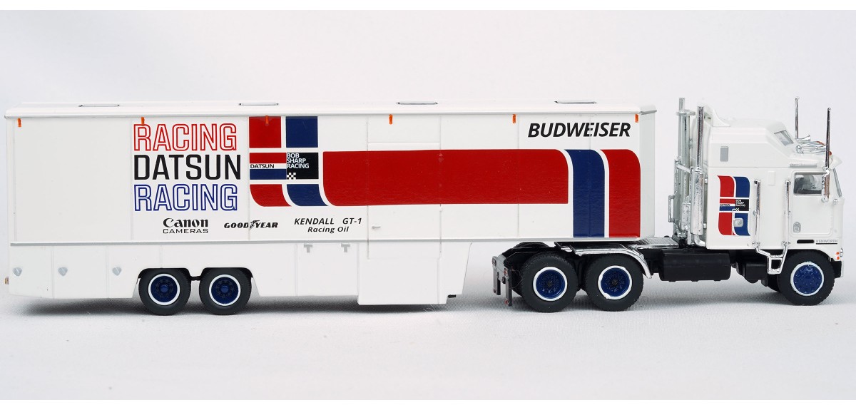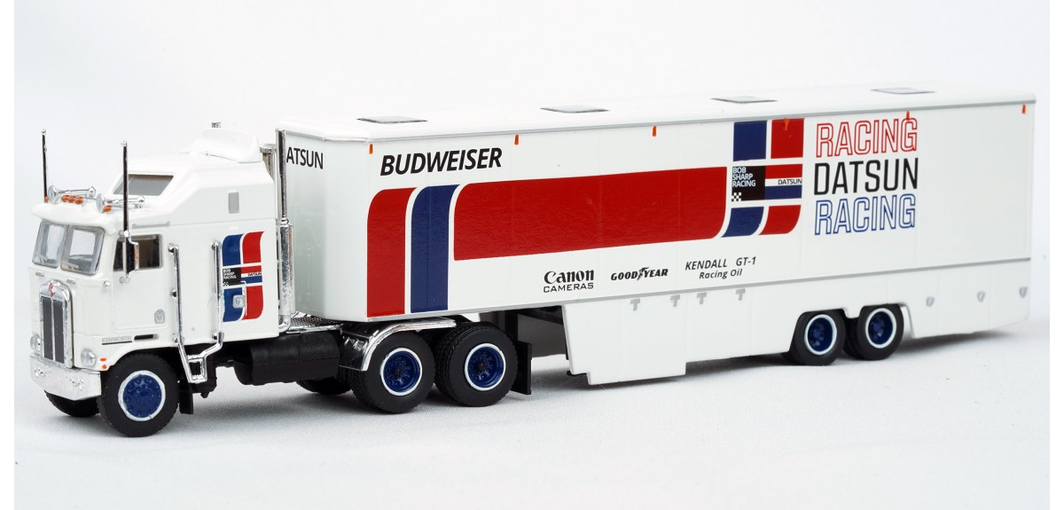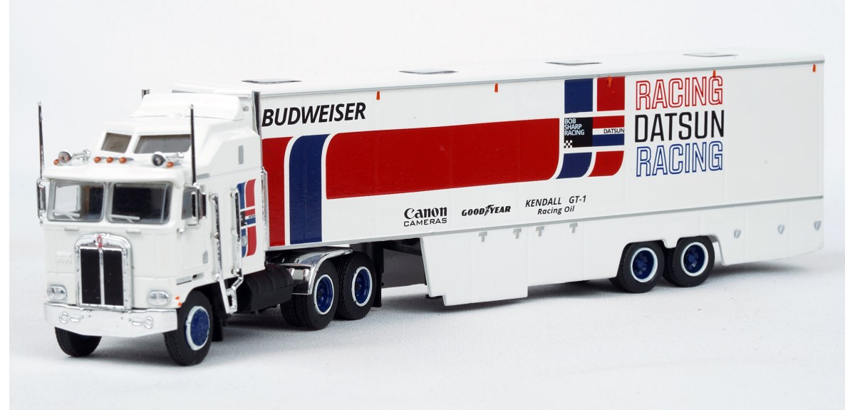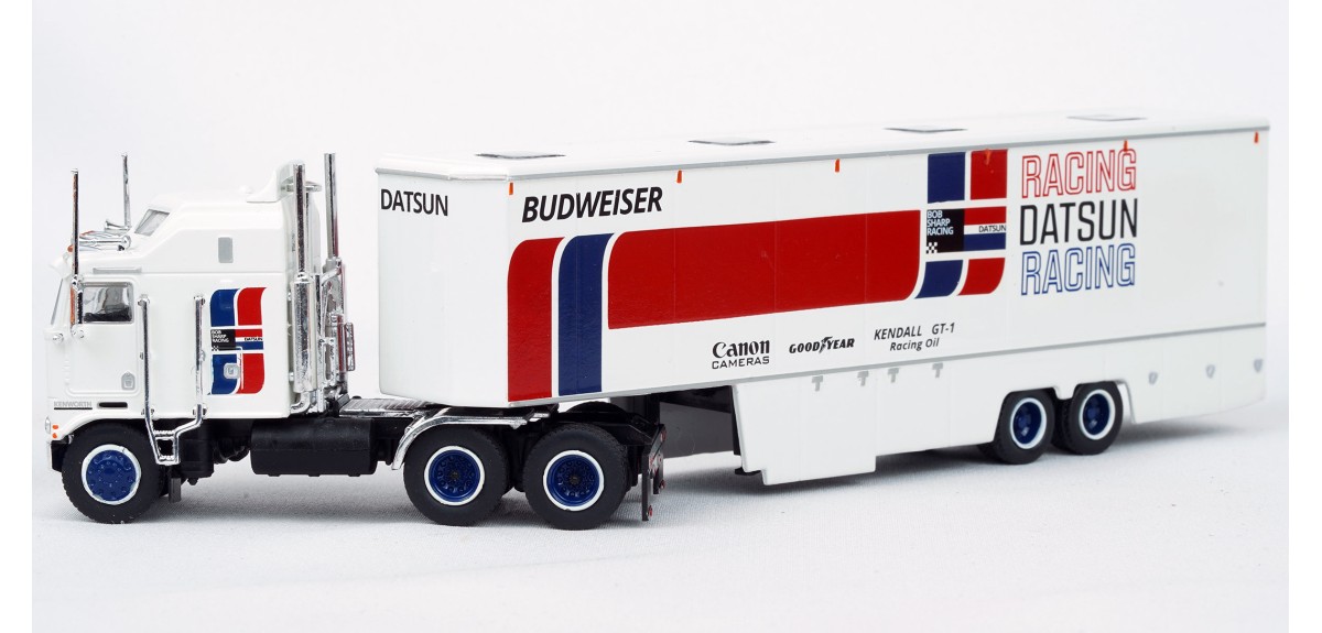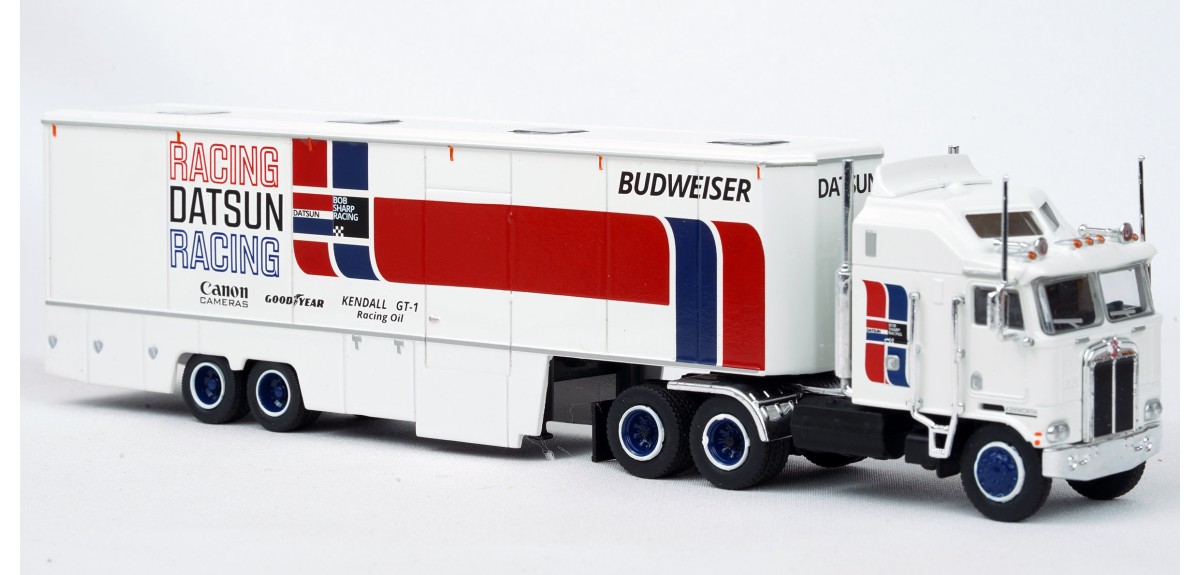 BR85740 HO Scale Brekina Kenworth K100 108"BBC Aerodyne COE Race Transporter - Datsun Racing