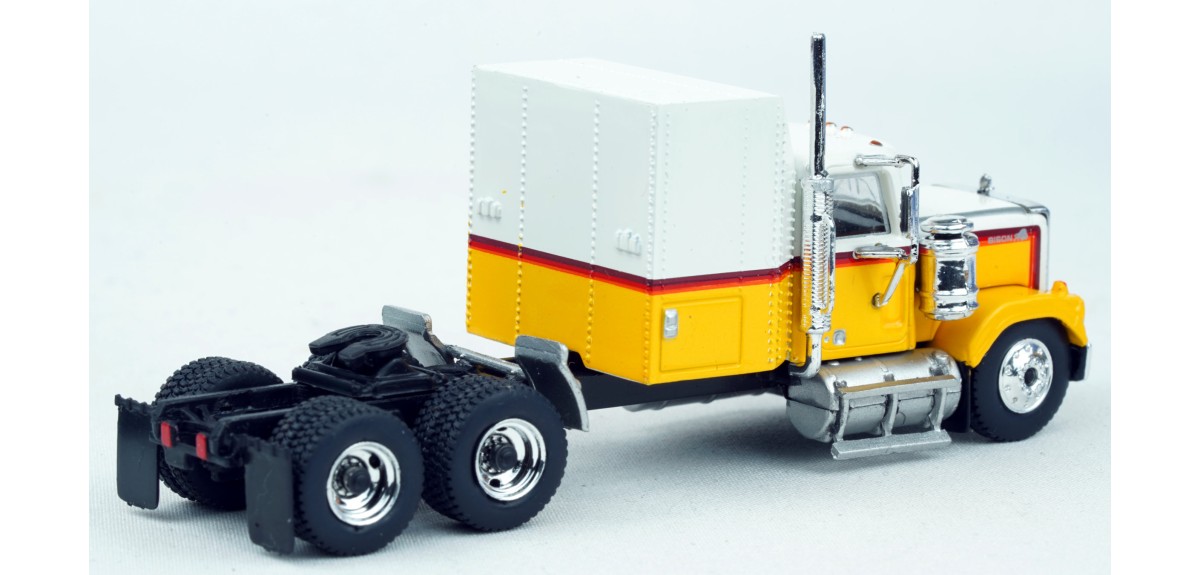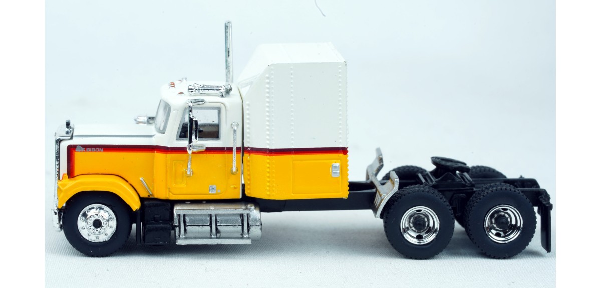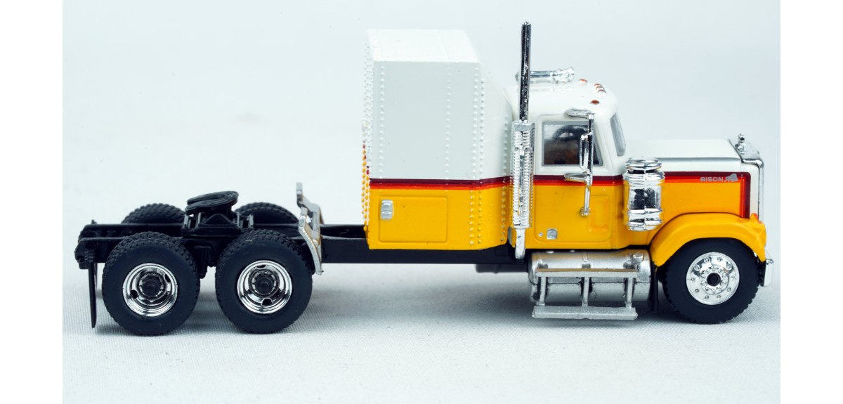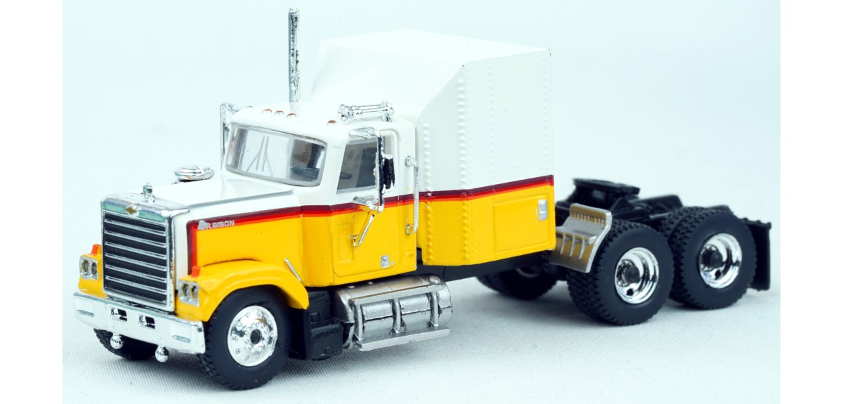 Brekina Chevrolet Bison tandem axle truck tractor Sleeper cab Prototype produced from 1977 to 1980 White/yellow paint scheme Chrome mirrors (buyer installed) Chrome grille, bumper, trim Chrome air cleaner Chrome exhaust stack Chrome horns Chrome 10 hole aluminum type front wheels Chrome 2 hole steel type drive wheels Silver rear quarter fenders November 2024 release New in box SKU #85782