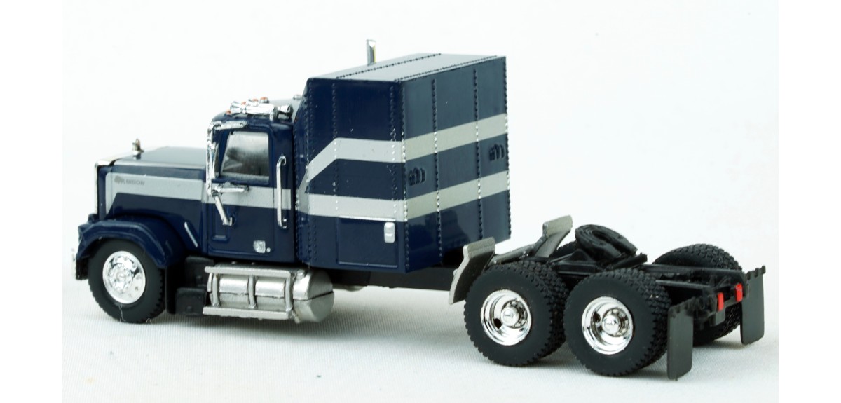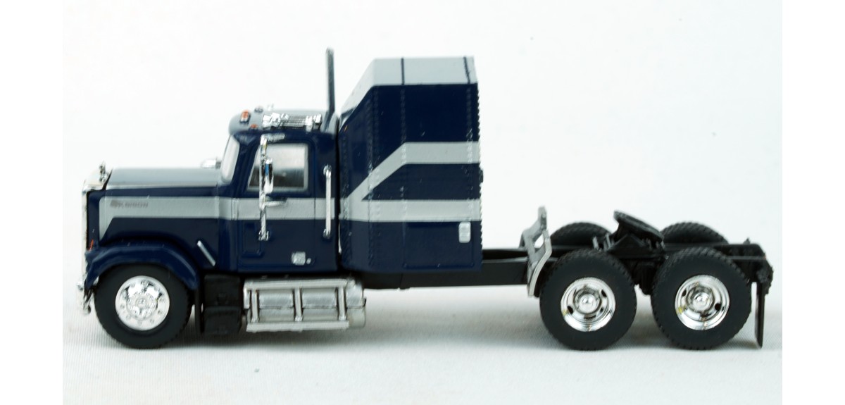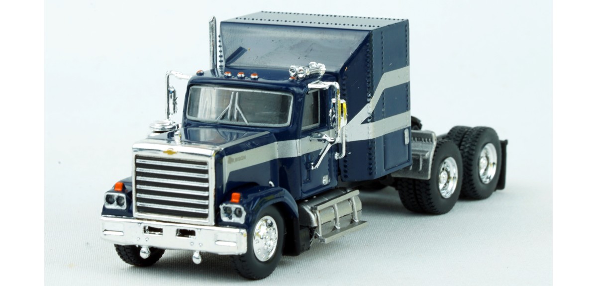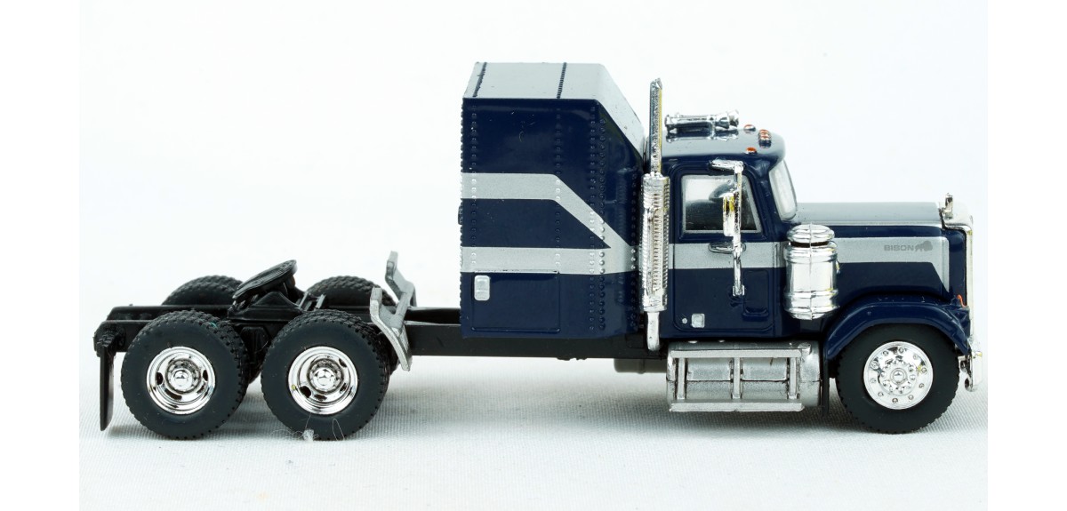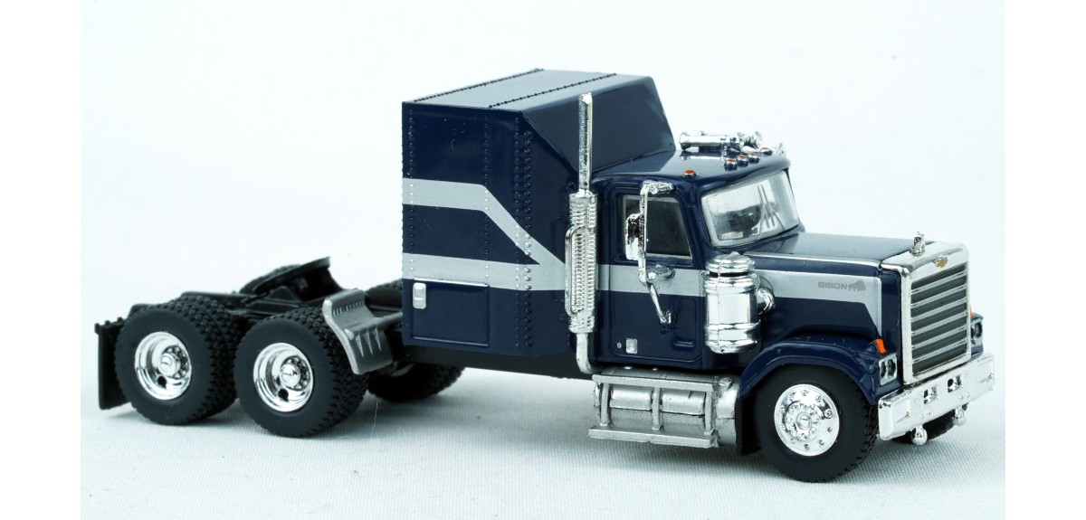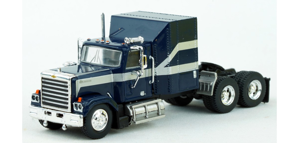 Brekina Chevrolet Bison tandem axle truck tractor Sleeper cab Prototype produced from 1977 to 1980 Dark blue paint scheme with silver stripe Chrome mirrors (buyer installed) Chrome grille, bumper, trim Chrome air cleaner Chrome exhaust stack Chrome horns Chrome 10 hole aluminum type front wheels Chrome 2 hole steel type drive wheels Silver rear quarter fenders February 2025 release New in box SKU #85785