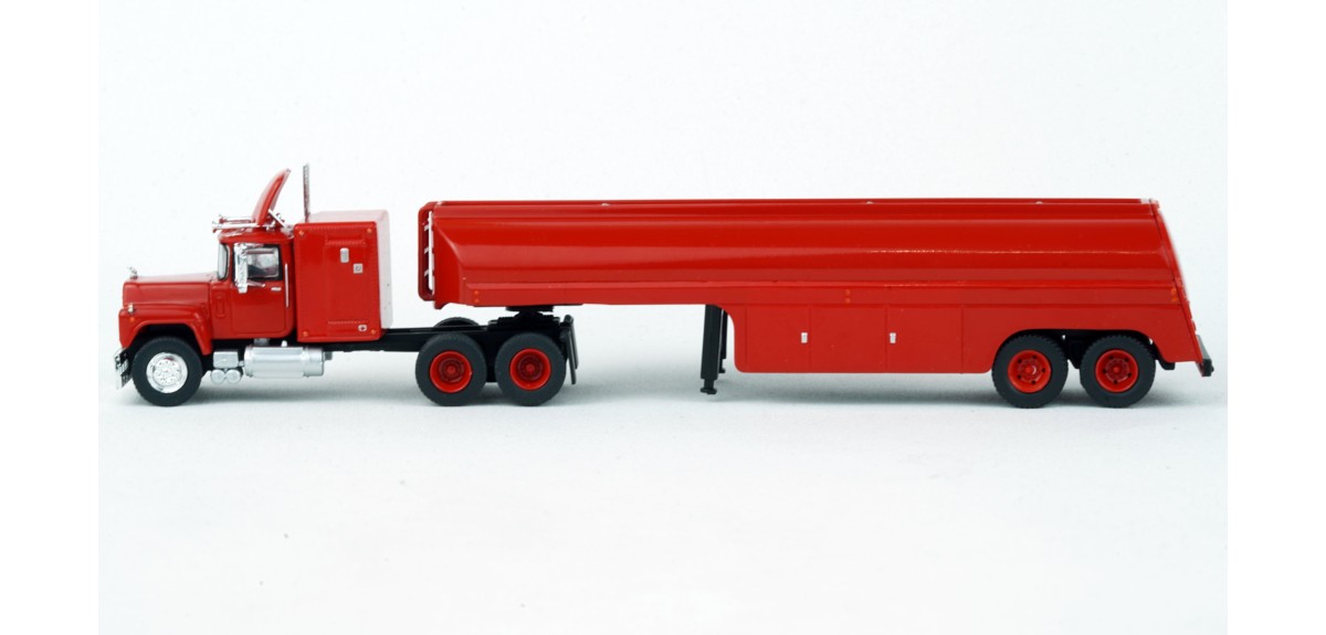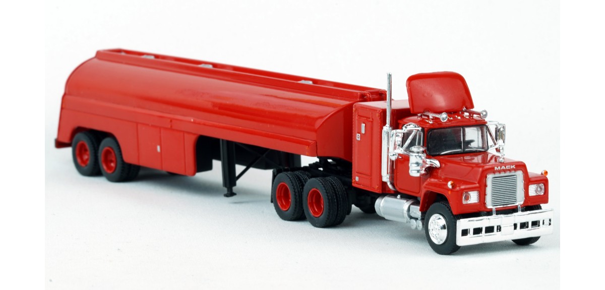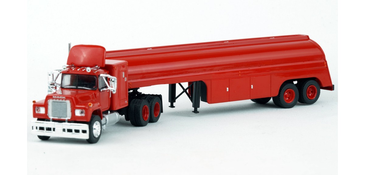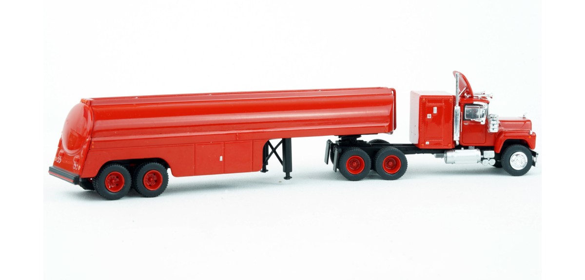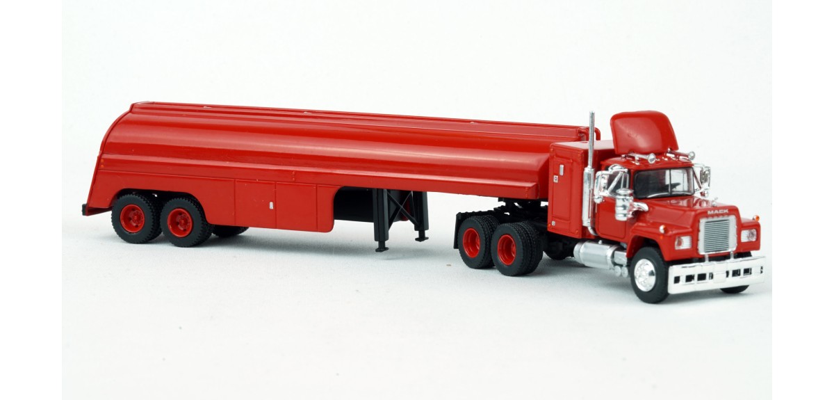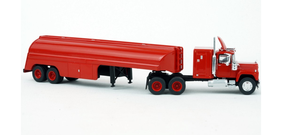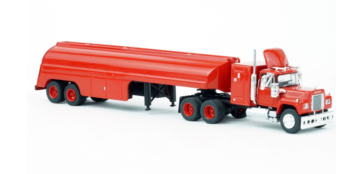 Brekina Mack RS700 tandem axle truck tractor 60" sleeper Prototype produced from 1966 to 1990s(!) Vintage tank trailer painted red Red truck tractor paint scheme