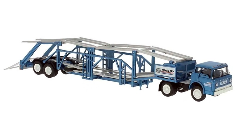 BR86332 HO Scale Brekina 1970 Ford C-Series COE Truck Tractor & Auto Transport Trailer Silver Blue - Shelby American Racing