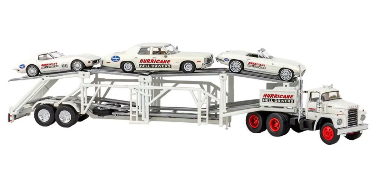 BRE90500 - HO Scale Brekina Dodge LCF CT-900 Tandem Axle Truck Tractor & Auto Carrier With Cars - White Hurricane Hell Drivers