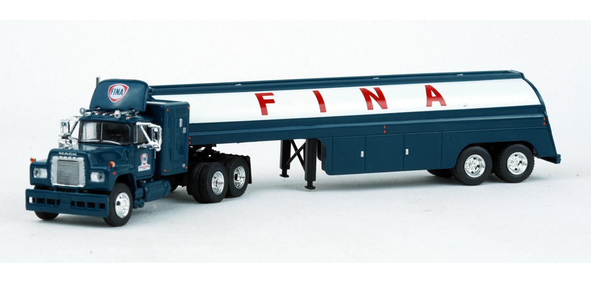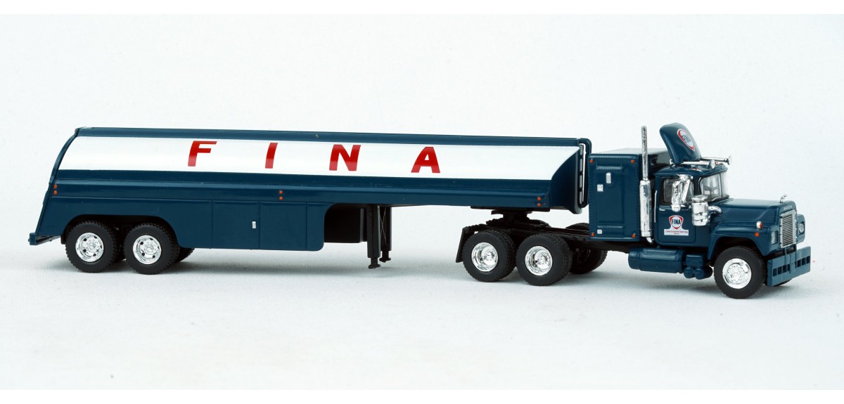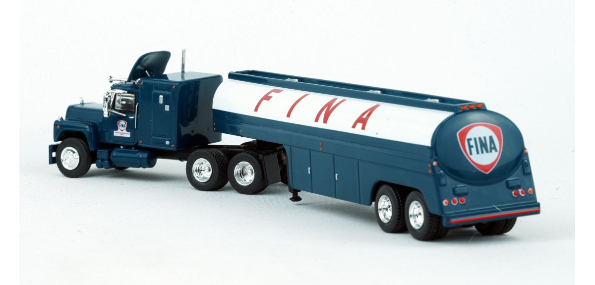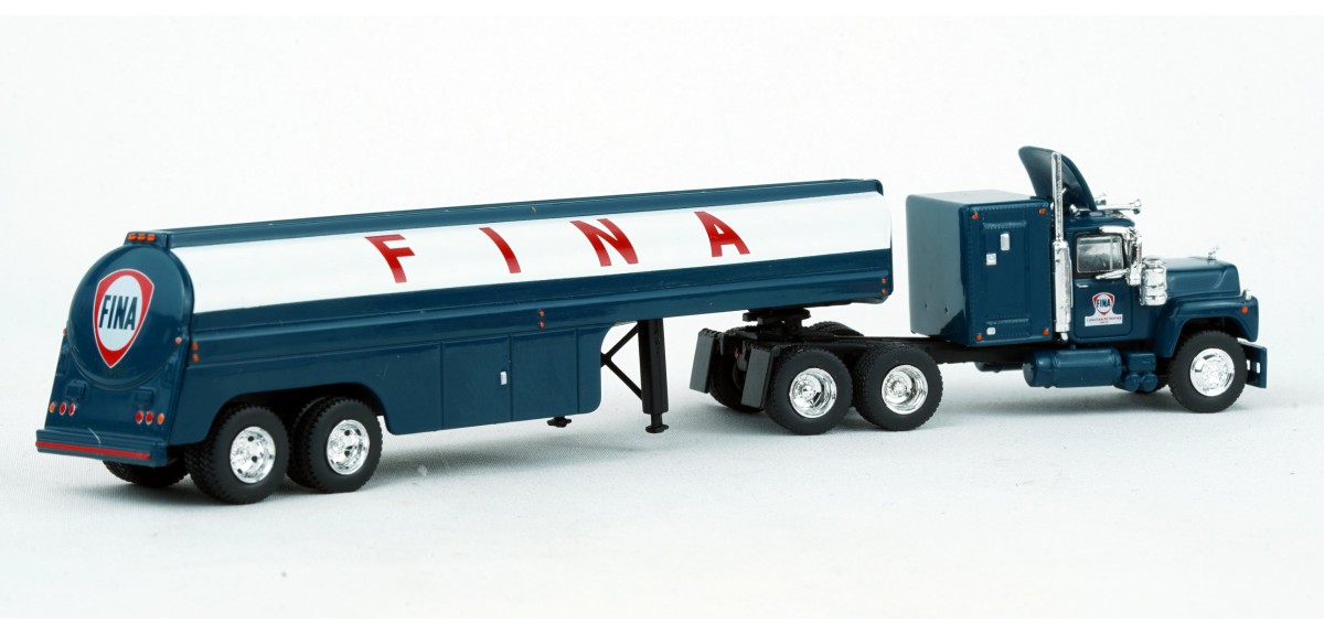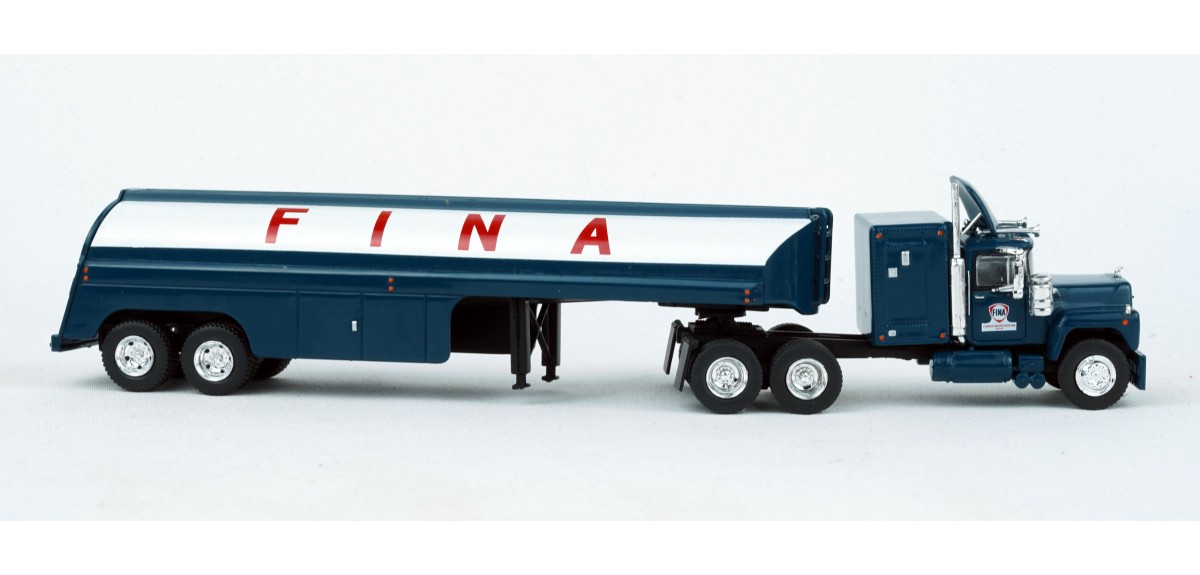 Brekina Mack RS700 tandem axle truck tractor 60" sleeper Prototype produced from 1966 to 1990s(!) Vintage fuel tank trailer painted silver with Fina logo Fina blue truck tractor paint scheme