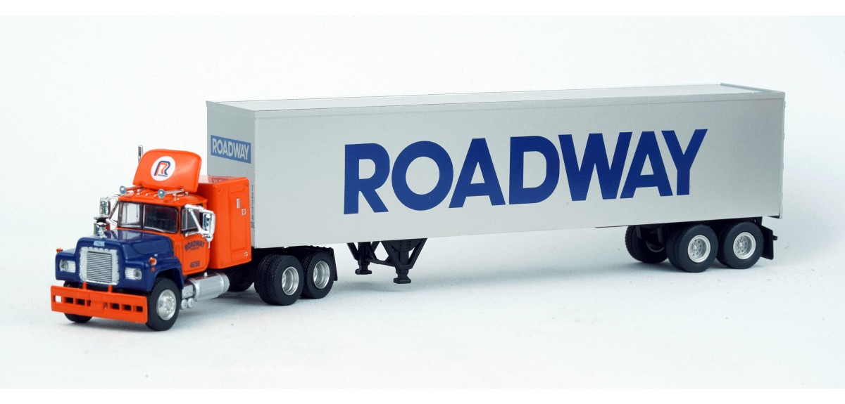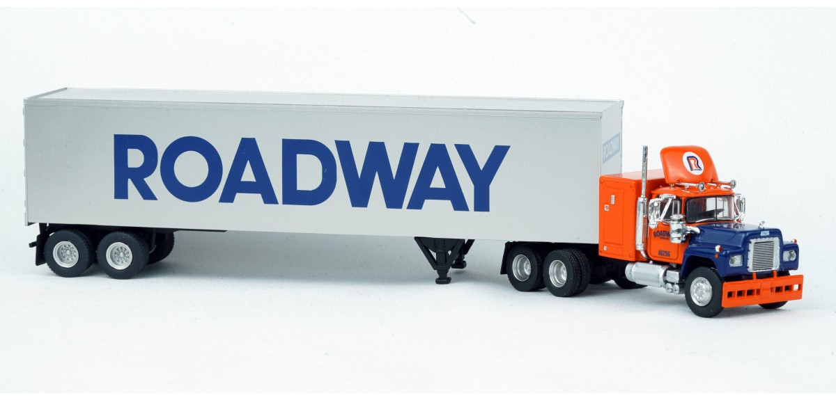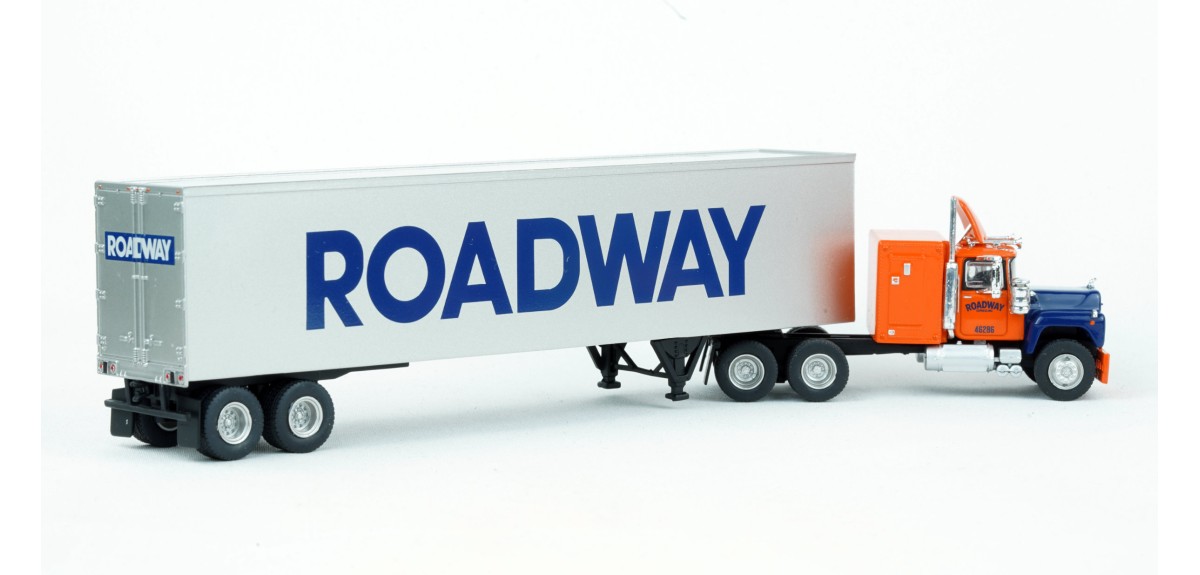 Brekina Mack RS700 tandem axle truck tractor 60" sleeper Prototype produced from 1966 to 1990s(!) 45' van trailer painted silver with Roadway logo Roadway orange & blue truck tractor paint scheme